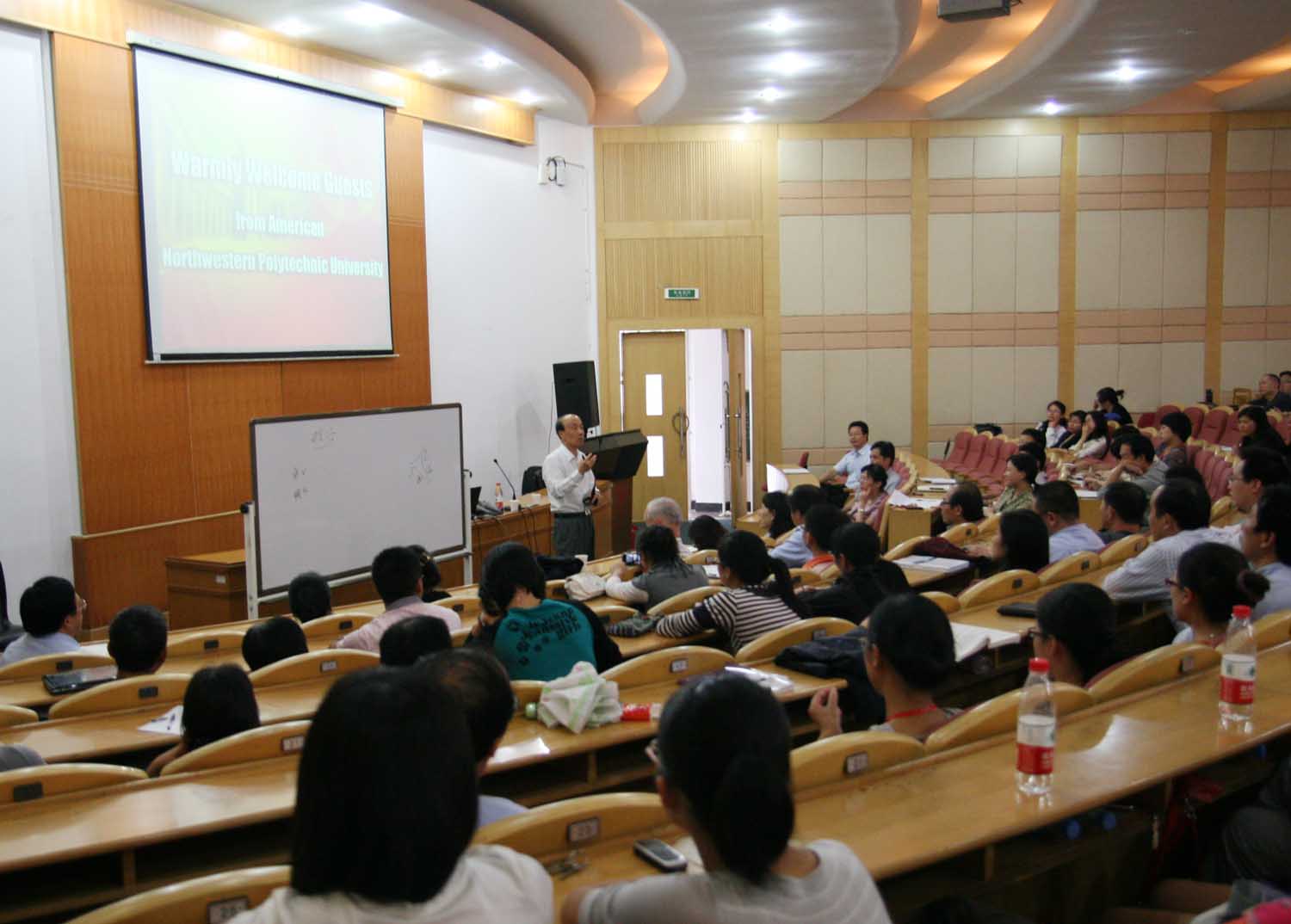 又讯:27日下午和晚上,谢佐齐校长不辞旅途劳顿,先后为我校教师和本科学生进行了两场演讲,其“目标导向”的教育理念,“以学生为主体和以实用为主导”的办学思想,“创意思维和行为一体化”的教学哲理,教育国际化背景下的教学观、学生观、质量观,以及风趣幽默极具感染力的演讲风格,使师生大开眼界、受益良多。