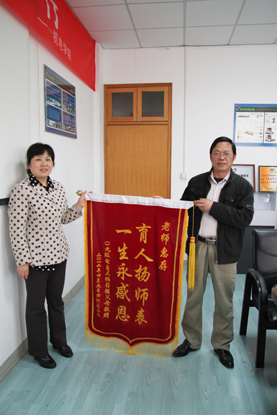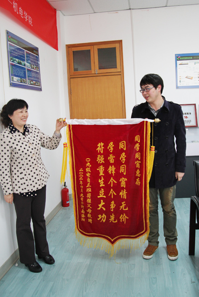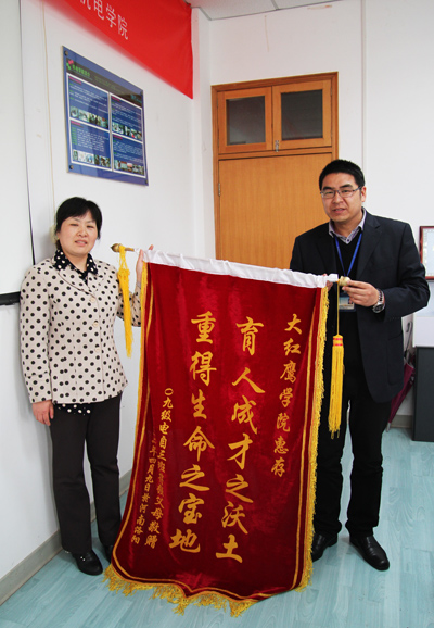 4月9日下午,几位特殊客人风尘仆仆来到机电学院,他们盛情地将三面锦旗送到该院负责人手里,锦旗上分别写着“育人成才之沃土,重得生命之宝地”、“育人扬师表,一生永感恩”、“同学同窗情无价”等内容。原来,这是我校机电学院09电自3班符同学的家长专程远道从河南赶到学校赠送锦旗,以感谢我校对其孩子的及时救治和无限关爱、老师的细致关怀和无微照顾、同学的热情帮助和无私援助。