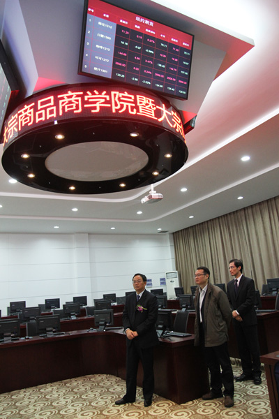 仪式结束后,张明华副市长等领导和嘉宾在卢秉恒校长、孙惠敏书记等陪同下一起参观了我校大宗商品实验中心。该中心包括大宗商品交易实验室、大宗商品物流实验室、大宗商品金融实验室、大宗商品地理信息中心,总投入近2000万。在观看了讲解员现场演示和解说后,张明华副市长等领导和嘉宾对大宗商品实验中心给予了充分肯定和高度赞赏。