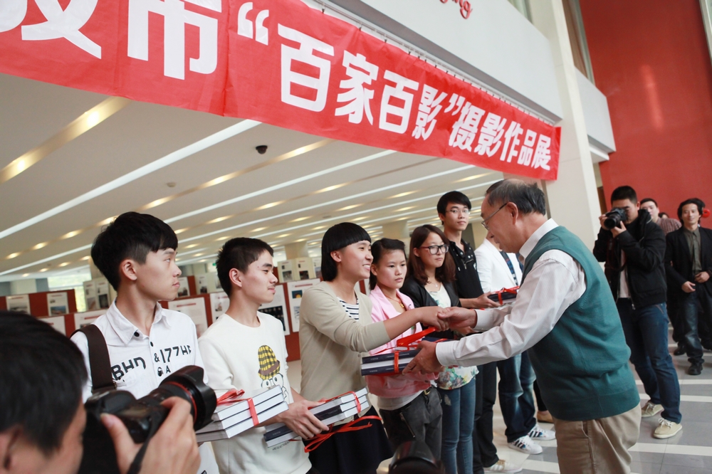 副校长李羽在致辞中说,在高校举办“百家百影”摄影作品展,不仅丰富了大学文化生活,而且促进了摄影艺术交流。沈一鸣主席在讲话中对大学生如何摄影、为什么要学摄影等问题作了很好的阐释。之后,沈一鸣主席向各高校学生代表赠送作品集。