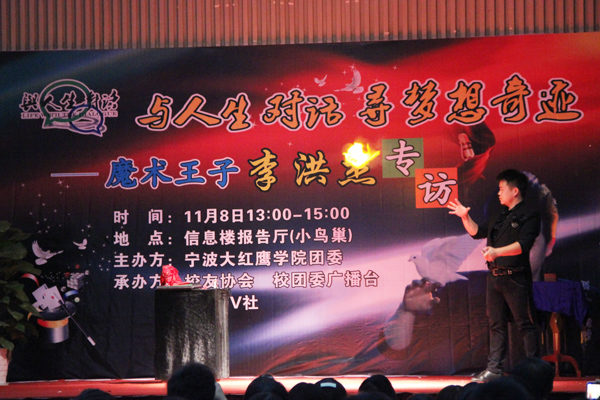 11月8日, 由校团委主办,校友协会、广播台、红鹰TV社共同承办的我校“与人生对话 寻梦想奇迹”校友访谈活动在信息楼报告厅举行,本次活动特邀“校园魔术王子”李洪杰校友为访谈嘉宾,与学弟学妹们畅谈大学生活,共话青春梦想。