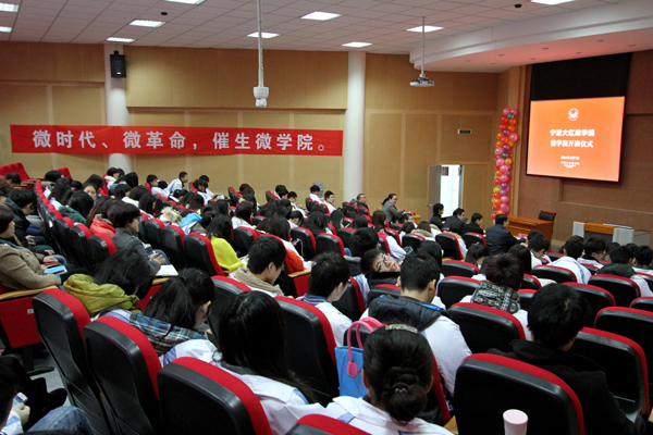仪式上,王明院长作了题为《微时代下的教育》的专题报告,他首先分析了“微”的涵义和“微时代”下社会与经济展现出来的新变化和新形势,明确了开办微学院,培养微人才的重要意义,并强调,微学院定位为专业教学、职业培训、创新创业三位一体的特色学院。接着,他向同学们详细介绍了社交网络、电子商务和财务管理三个专业的培养方案。报告中,王院长还不时鼓励学生运用专业优势,勇于创业,利用校内外资源不断实践。