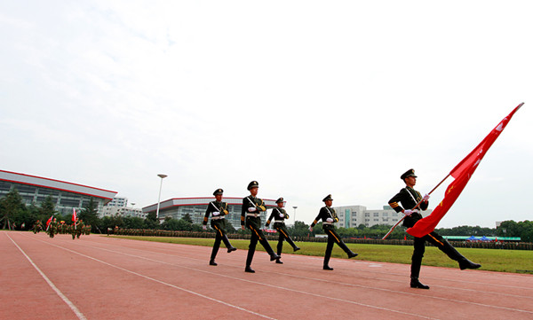 庄严的升旗仪式后,阅兵式正式开始。校党委书记孙惠敏在副书记林长兴、副校长李羽的陪同下对军训师进行了检阅;随后,军训师在雄壮的解放军进行曲中进行了分列式表演,向领导和老师汇报十余天来的军训成果。