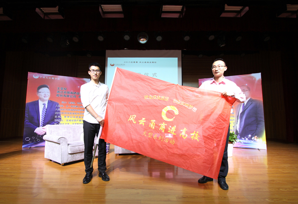 4月28日下午,2015宁波市大学生“创青春”系列活动——创青春·风云甬商进高校在我校正式启动。浙江省围海建设集团股份有限公司总经理王掌权、宁波乐歌视讯科技股份有限公司董事长项乐宏与大学生对话,分享创业历程和感悟。