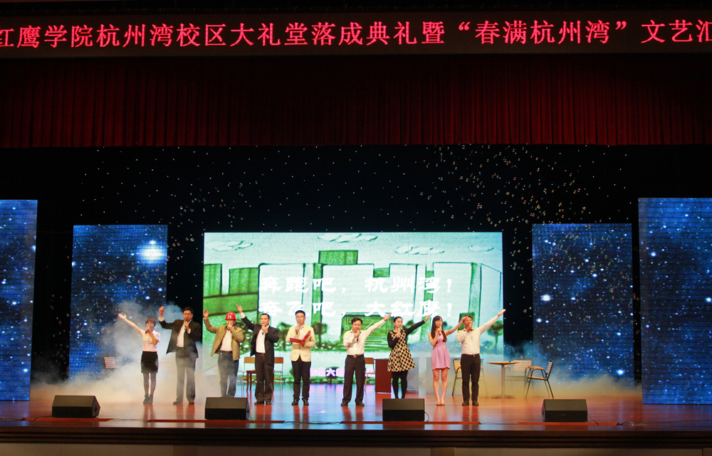 典礼上,还举行了“春满杭州湾”文艺汇演。整场节目精彩纷呈,高潮迭起。铿锵有力的激光水鼓《欢欣鼓舞》振奋人心;诗歌朗诵《“六”在心中的记忆》回顾了新校区工作者六年以来,情定杭州湾、奉献新校区的点点滴滴;由基础学院学工团队自编自导的情景剧《辅导员去哪儿》活泼幽默,真挚感人。歌伴舞、礼仪操、健美操等节目或歌或舞、惊艳绝伦,引起观众们的阵阵掌声。
