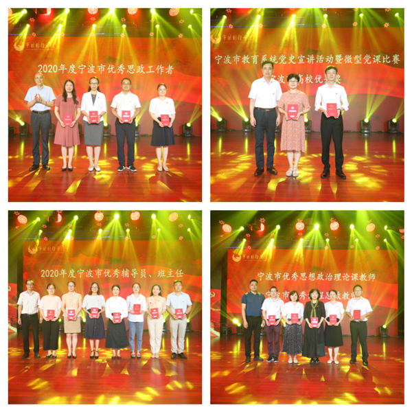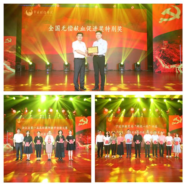 近年来,我校党员师生认真学习贯彻习近平新时代中国特色社会主义思想,深入开展党史学习教育,围绕立德树人根本任务,立足本职岗位,积极贡献,涌现出一大批在全国、全省、全市和全校范围内具有广泛影响力的先进典型。活动特意组织了颁奖仪式,对他们进行了表彰。与会领导先后为全国无偿献血促进奖特别奖获得者、浙江省第一届高校教师教学创新大赛获奖者、市教育局“两优一先”评选活动获奖者、2020年度宁波市高校思想政治工作系列评选活动获奖者、宁波市教育系统党史宣讲活动暨微型党课比赛获奖选手、2021年宁波市大学生篮球联赛体育道德风尚奖获奖球队及教练、学校第八届“师德标兵”评选活动获得者和学校2019-2021两学年“党员示范岗”先进个人颁发了荣誉证书、奖牌。