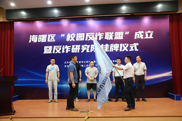 为更好的实施精准反诈,7月15日下午,海曙区“校园反诈联盟”成立暨反诈研究院挂牌仪式活动在我校举行。海曙区副区长、公安分局局长宣业靖,校党委书记周波等领导,市委政法委、市公安局、市教育局、区委政法委、区公安分局、区教育局、区司法局、高桥镇、海曙移动公司等单位以及反诈研究院成员、“校园反诈联盟”志愿者参加活动。